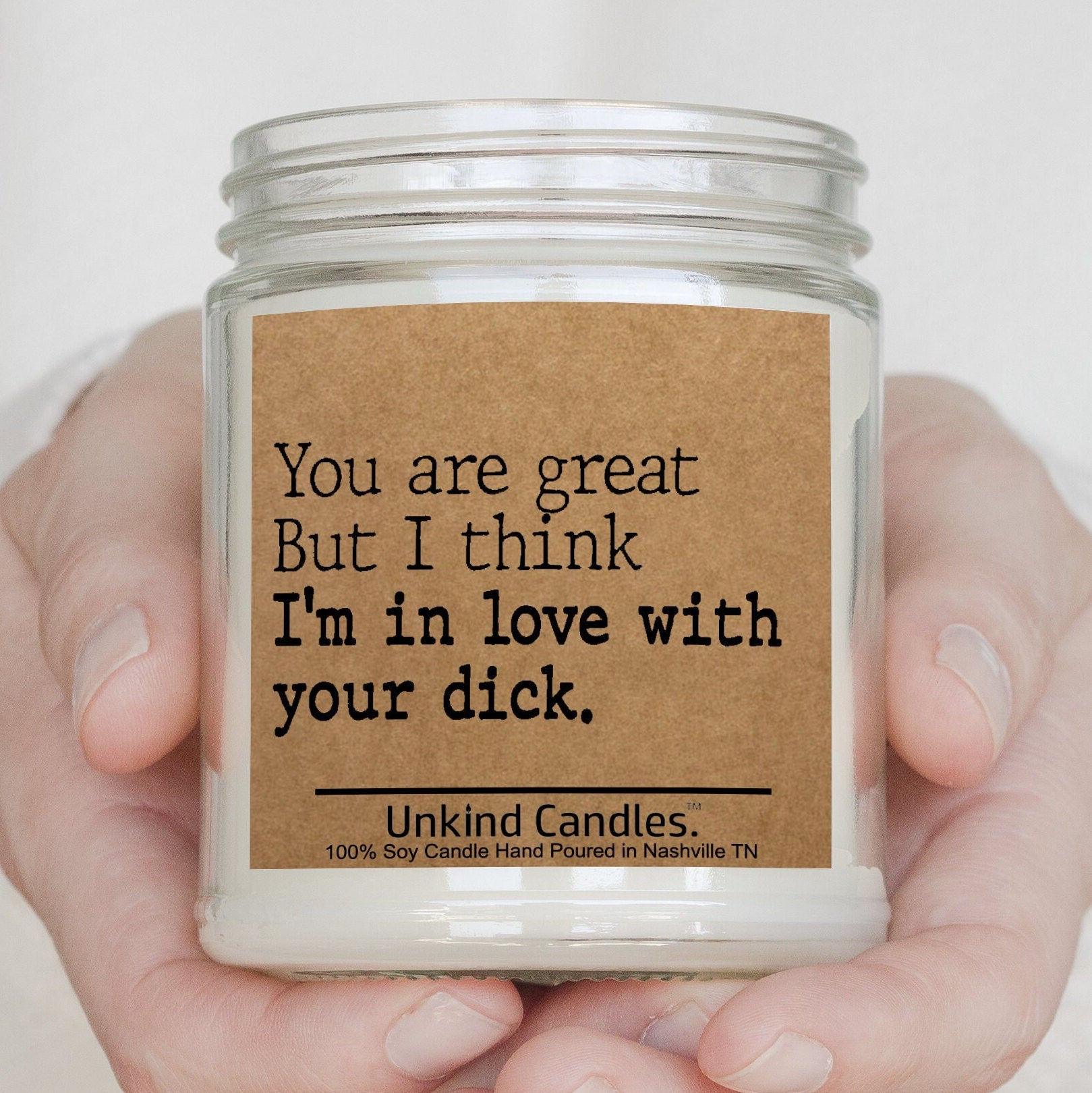 Candle reads "You are great but I think I'm in love with your dick"