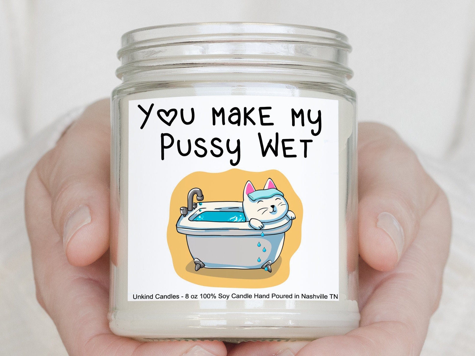 Candle reads, "You Make My Pussy Wet". With a picture of a kitty in a bathtub. The Perfect double entendre to say how you feel. a perfect gift for the cat loving couple with a sense of humor.